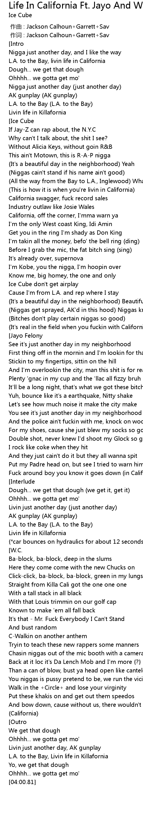 | [02:18.75] | Fuck around boy you know it goes down (in California) |