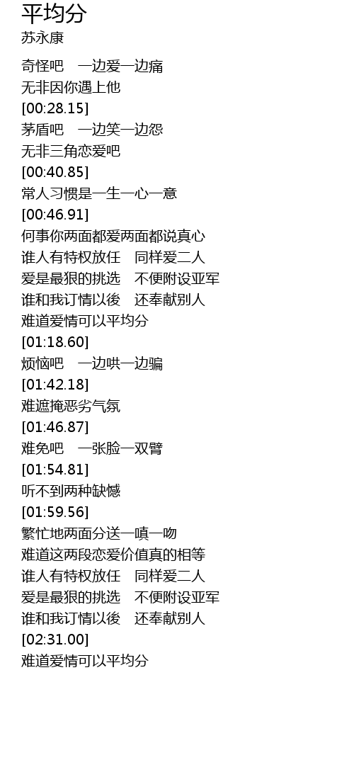 | [02:31.56] | nan dao ai qing ke yi ping jun fen |