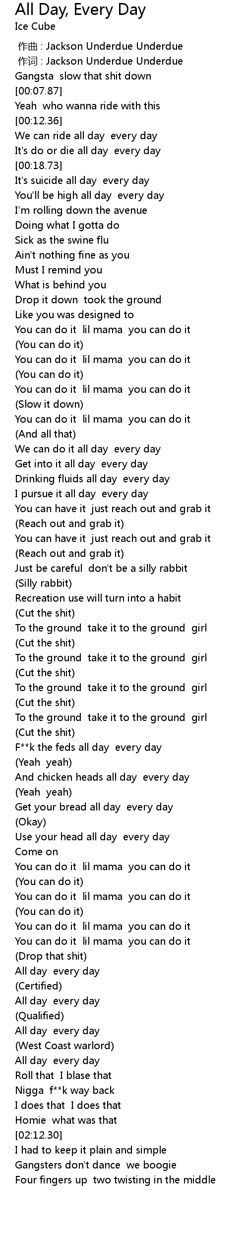 | [02:00.94] | All day every day |