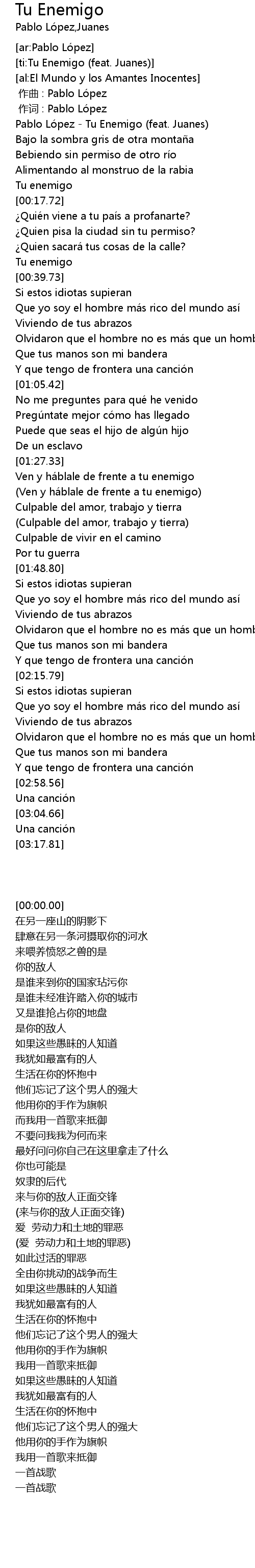 | [00:00.00] | Pablo López - Tu Enemigo (feat. Juanes) |