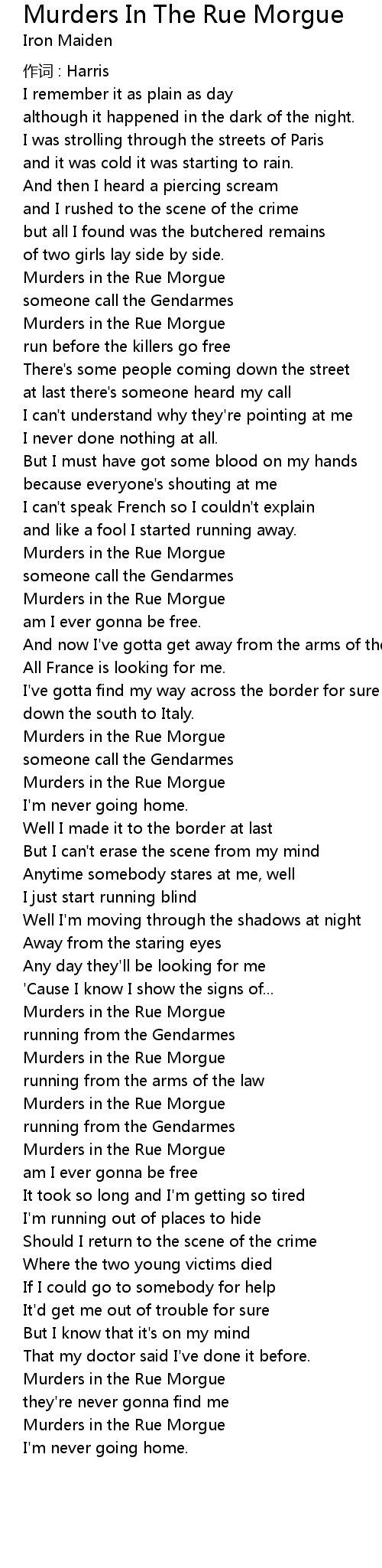 | Song | Murders In The Rue Morgue |