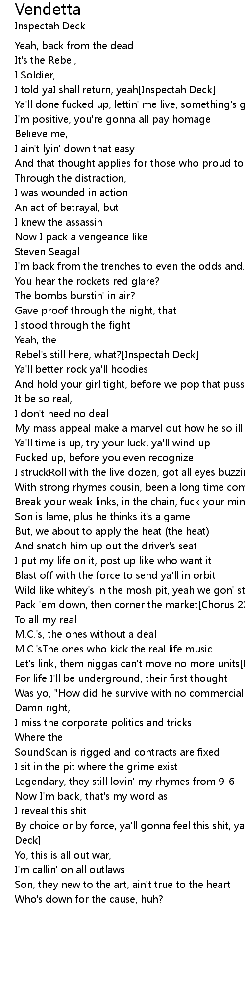 I'm back from the trenches to even the odds and...[Chorus 2X: Inspectah Deck] |