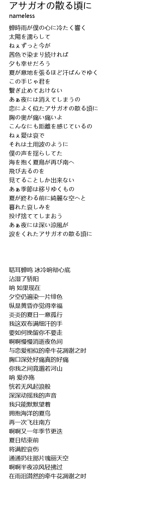 | [00:58.51] | 恋によく似たアサガオの散る頃に |