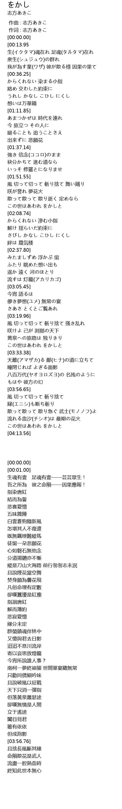 | [04:01.21] | 散って散って 散り急ぐ 武士(モノノフ)よ |