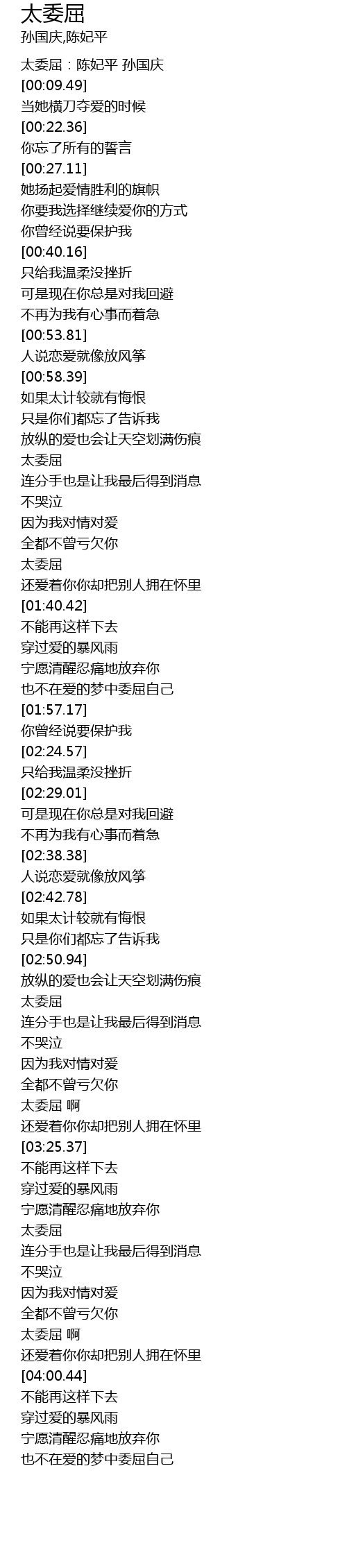 | [00:03.84] | 太委屈:陈妃平 孙国庆 |