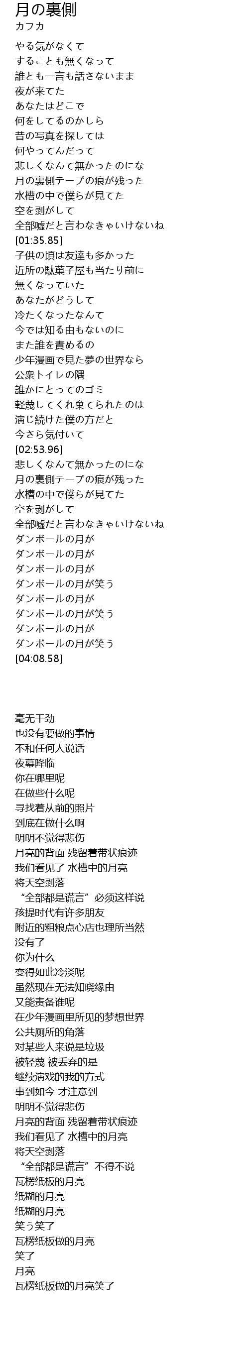 | [01:08.76] | 月の裏側テープの痕が残った |