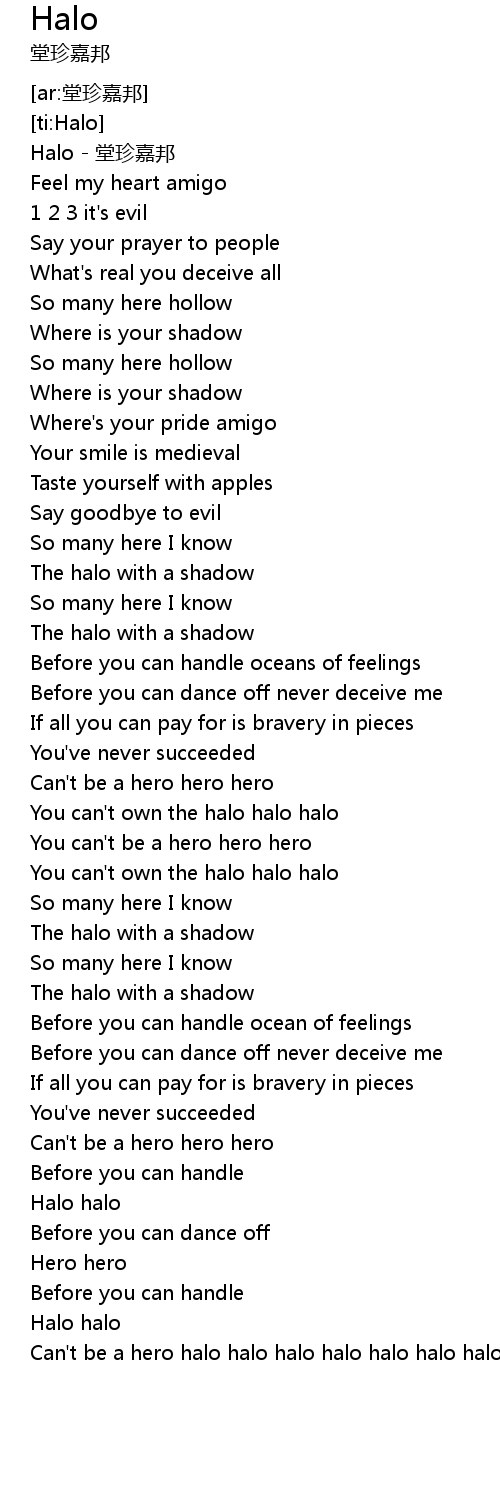| [04:15.64] | Can't be a hero halo halo halo halo halo halo halo halo |
