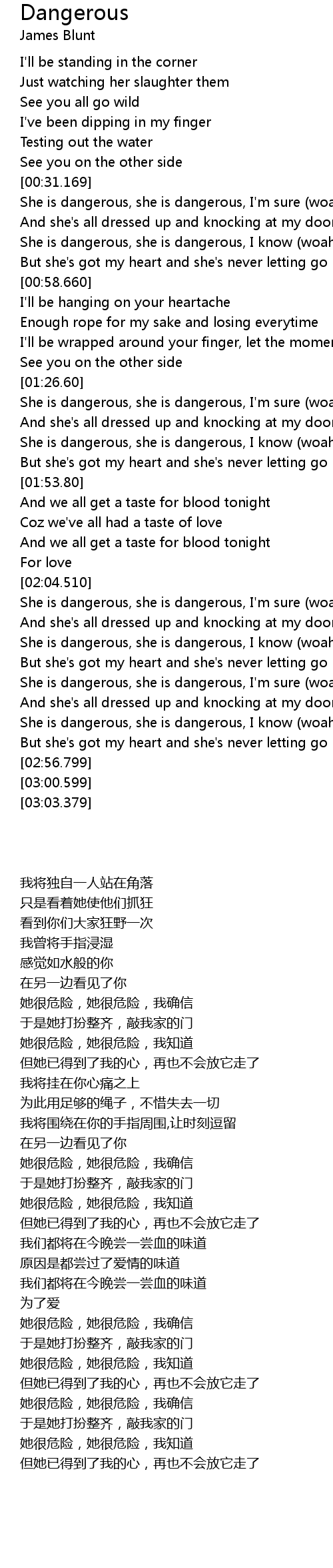 | [00:33.260] | She is dangerous, she is dangerous, I' m sure woah |