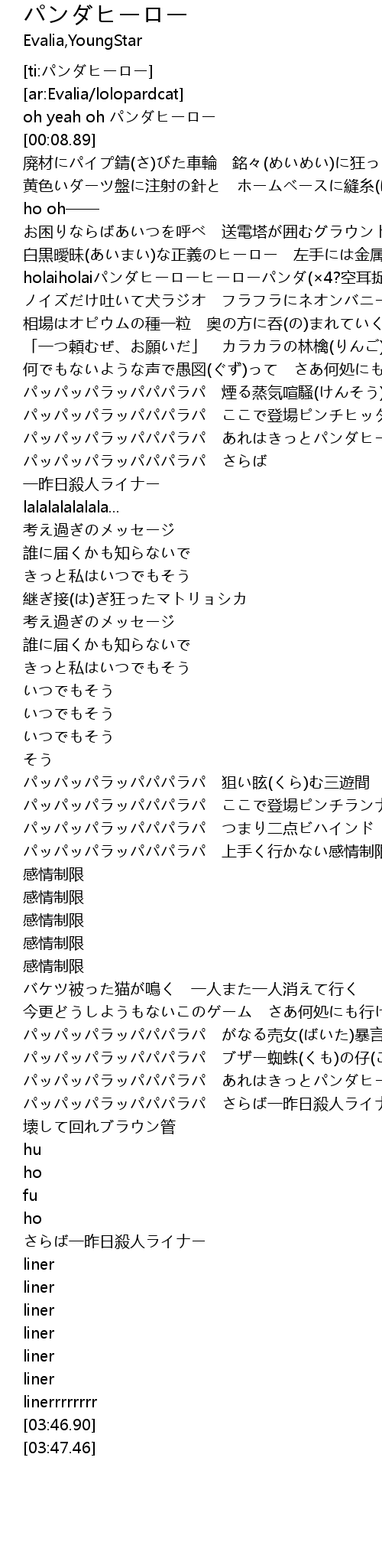 | [03:05.16] | パッパッパラッパパパラパ あれはきっとパンダヒーロー |