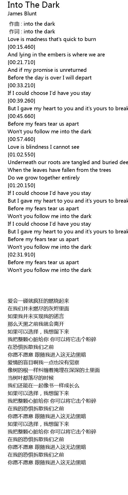| [01:39.320] | Won' t you follow me into the dark |