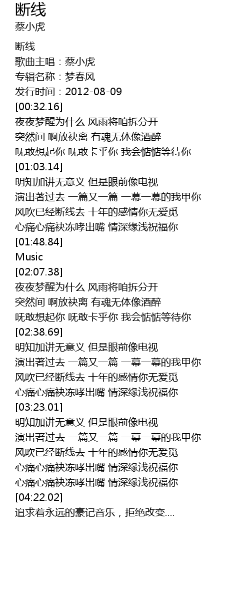 | [00:03.68] | 歌曲主唱:蔡小虎 |