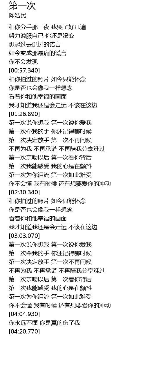 | [03:24.960] | 不再为我 不再承诺 不再陪我分享难过 |