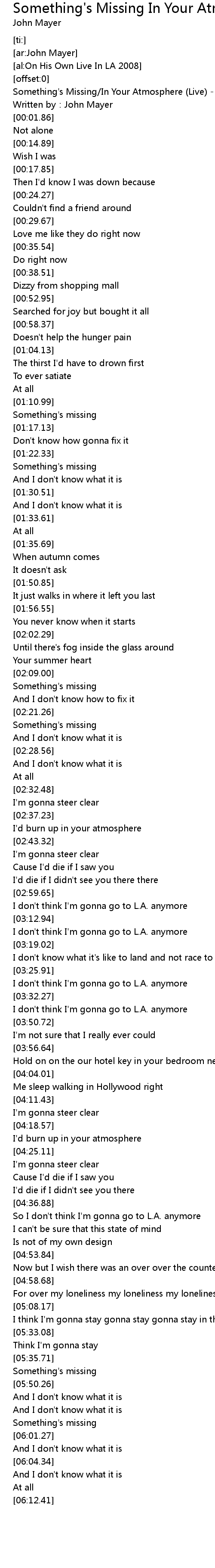 | [00:00.62] | Something' s Missing In Your Atmosphere Live John Mayer |