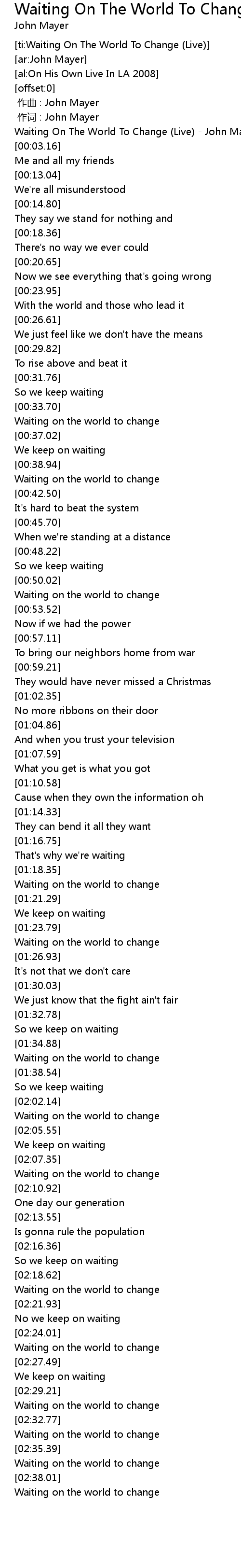 | [00:00.82] | Waiting On The World To Change (Live) - John Mayer |