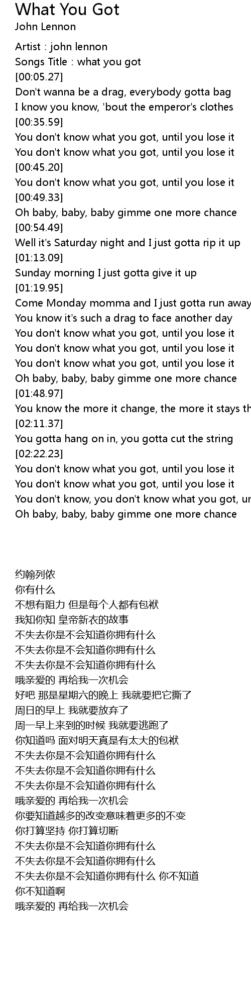 | [00:45.70] | You don' t know what you got, until you lose it |