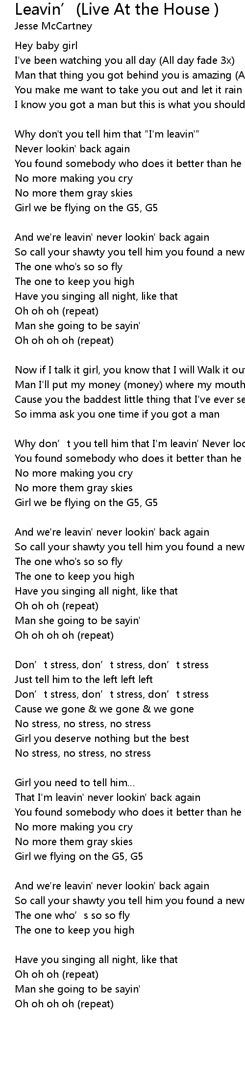 | And we' re leavin' never lookin' back again | |