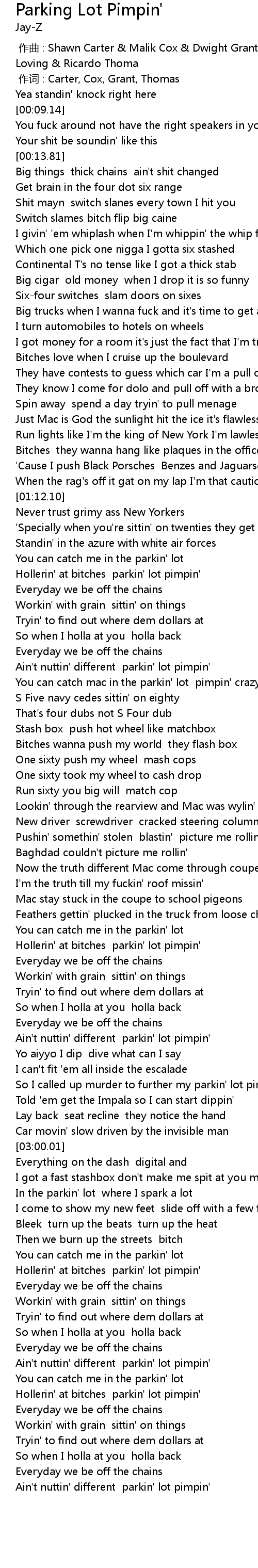 | [03:56.83] | Ain't nuttin' different parkin' lot pimpin' |