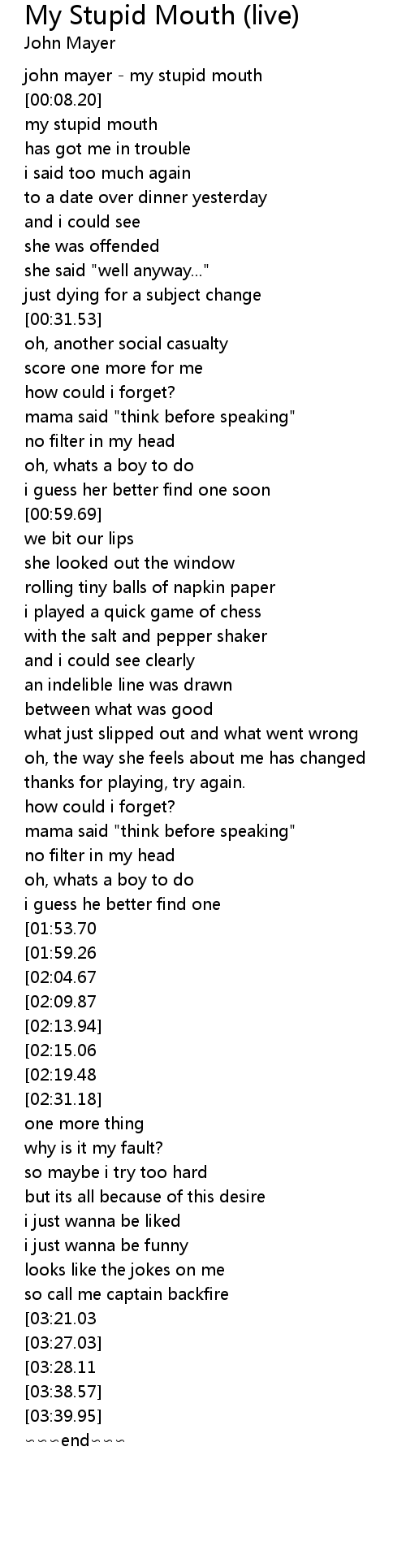 | [00:00.10] | john mayer my stupid mouth |
