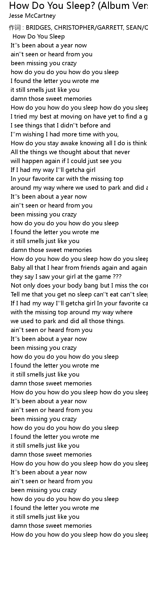 | Tell me that you get no sleep can''t eat can''t sleep till I come see you | |