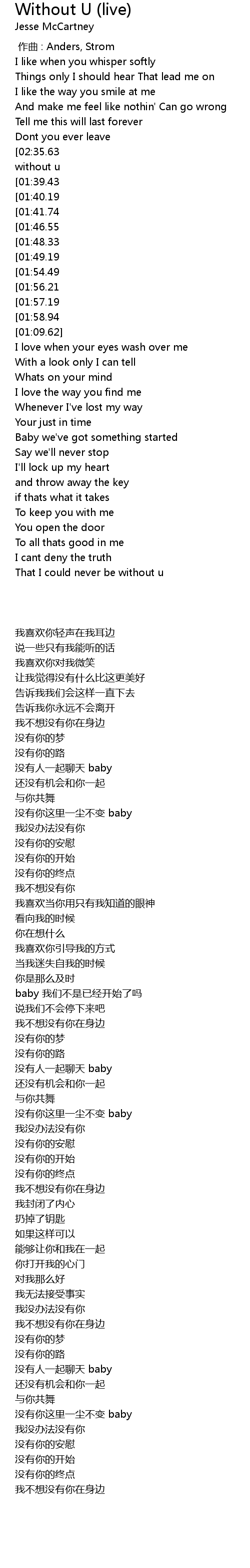 | [02:55.63][01:57.19][00:57.26] | Begin without u |
