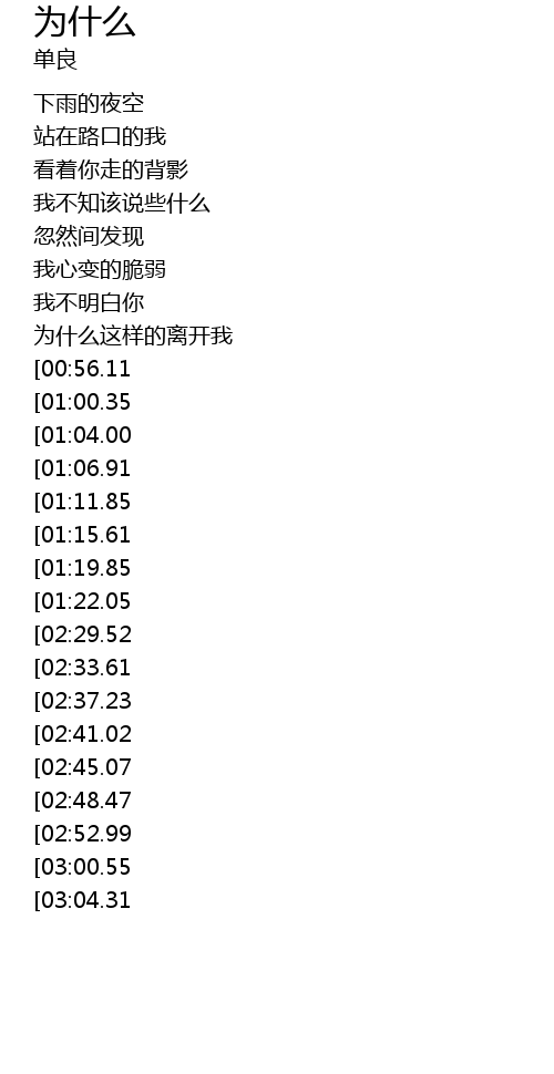 | [03:44.11][02:52.99][01:50.02] | 为什么 为什么 |