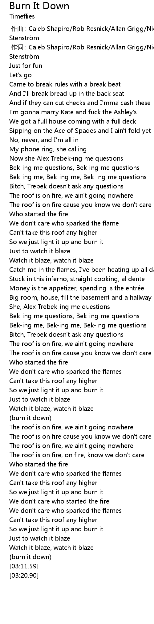 | [00:43.94] | The roof is on fire cause you know we don't care |