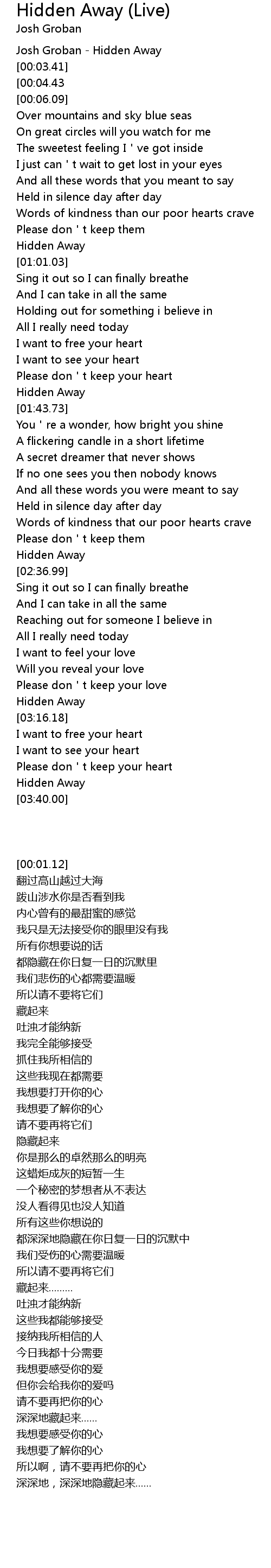 | [00:01.12] | Josh Groban Hidden Away |