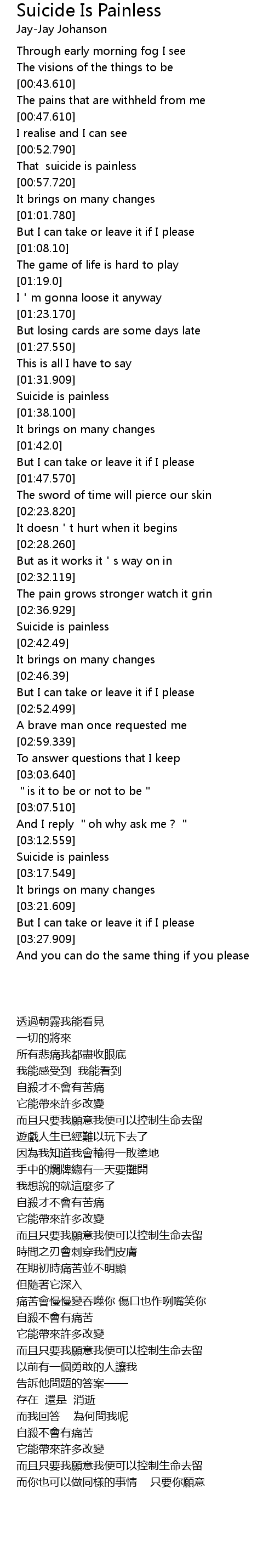 | [02:39.679] | Suicide is painless |