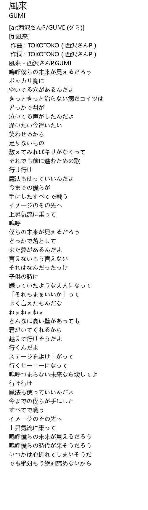 | [00:00.51] | 風来 - 西沢さんP,GUMI |