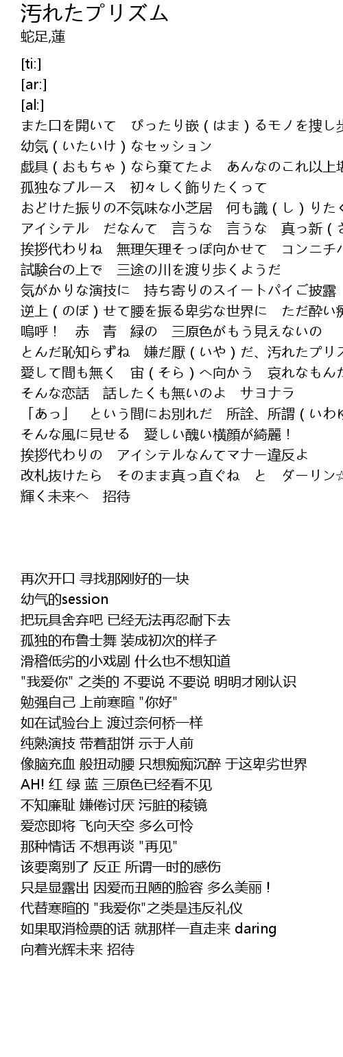 | [02:19.25] | とんだ恥知らずね 嫌だ厭(いや)だ、汚れたプリズム |