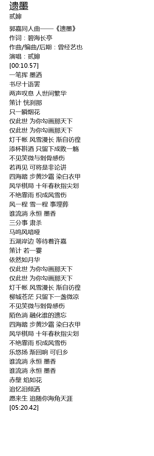 | [00:00.92] | 郭嘉同人曲——《遗墨》 |