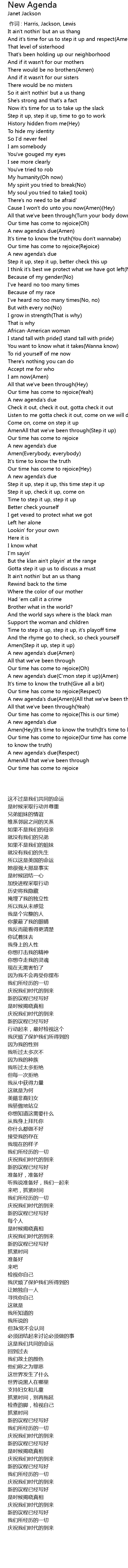 | [03:31.449] | A new agenda' s due Amen All that we' ve been through |