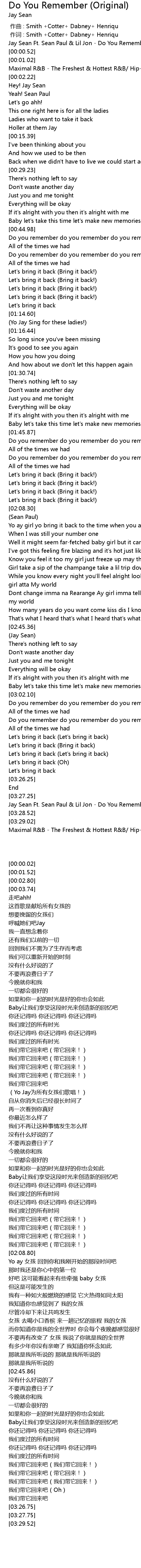 | [00:00.02] | Jay Sean Ft. Sean Paul & Lil Jon - Do You Remember |