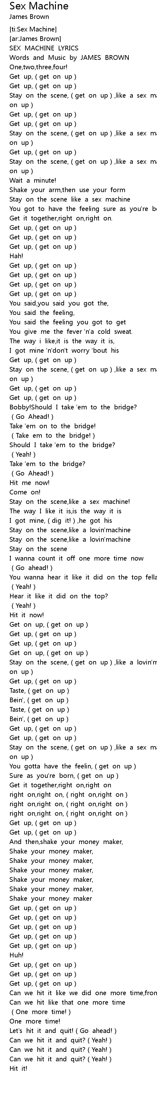 | [02:16.226] | Stay on the scene, like a sex machine! |