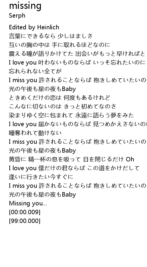 | [03:22.83] | I miss you 許されることならば 抱きしめていたいのさ |