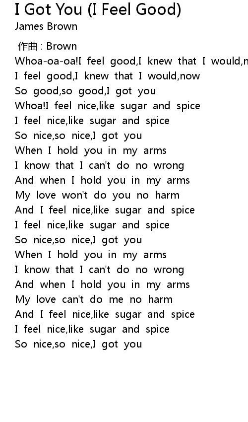 | [00:00.763] | Whoa-oa-oa!I feel good,I knew that I would,now |