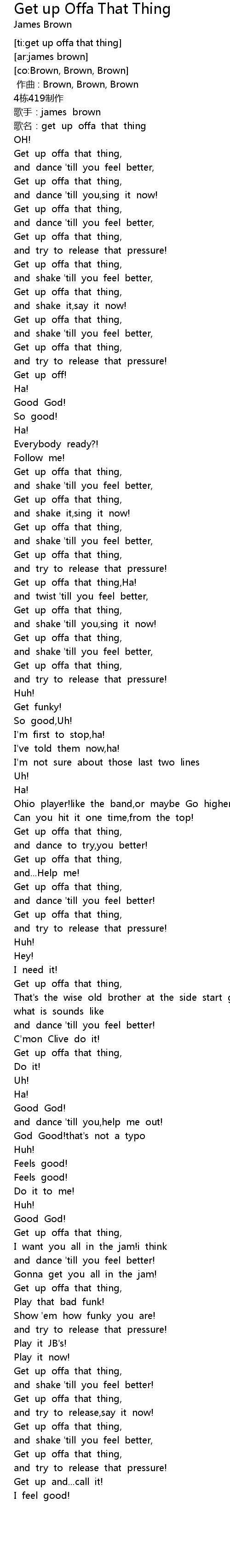 | [00:01.790] | 歌名:get up offa that thing |