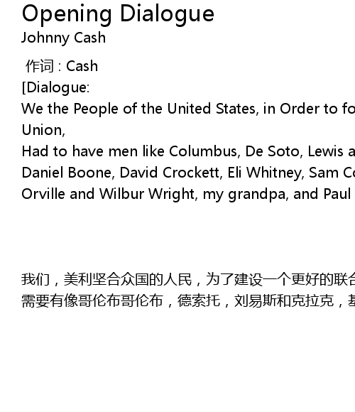 | [00:05.85] | Had to have men like Columbus, De Soto, Lewis and Clark, Kit Carson, Daniel Boone, David Crockett, Eli Whitney, Sam Colt, Thomas Edison, Henry Ford, Orville and Wilbur Wright, my grandpa, and Paul Revere. |
