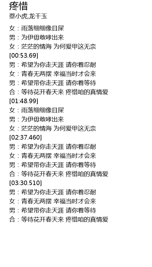 | [01:32.289] | 合:等待花开春天来 疼惜咱的真情爱 |