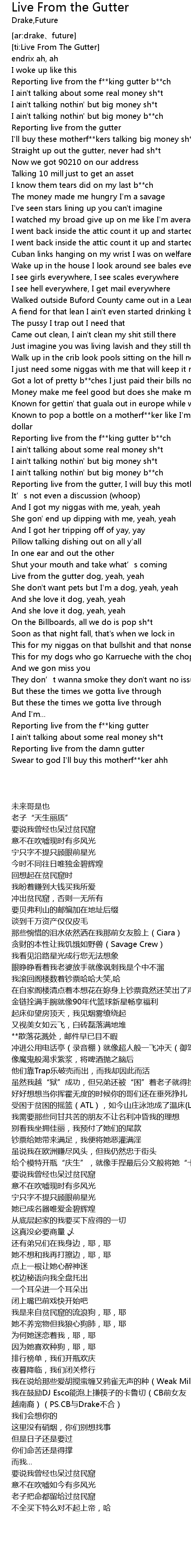 | [02:22.72] | Live from the gutter dog, yeah, yeah |