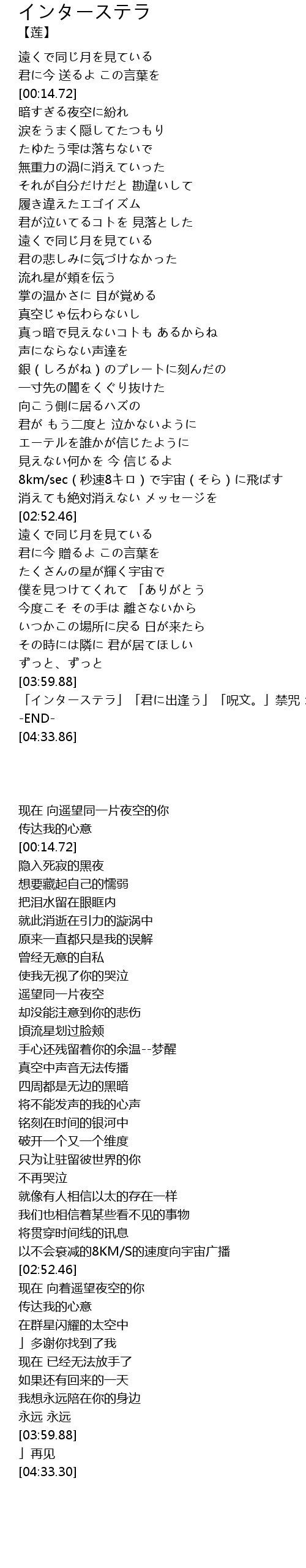 | [04:06.96] | 「インターステラ」「君に出逢う」「呪文。」禁咒:「インターステラ |