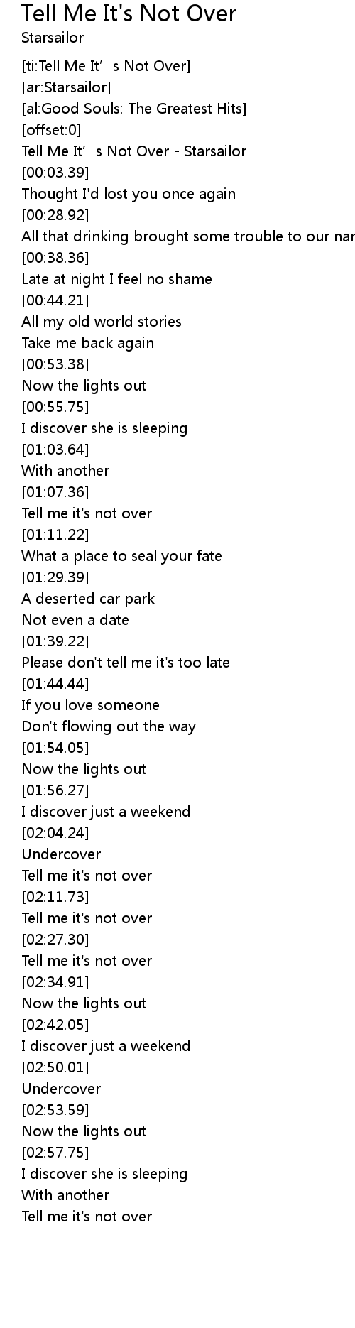 | [00:01.75] | Tell Me It' s Not Over Starsailor |