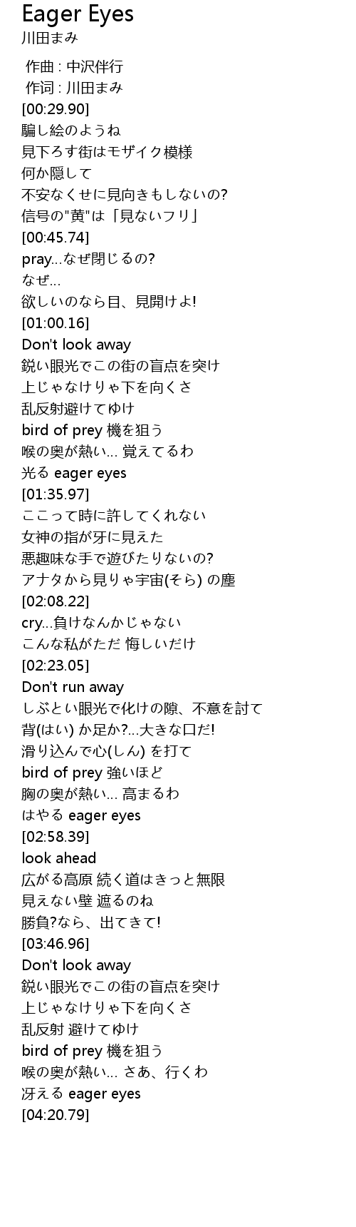 | [04:14.49] | 冴える eager eyes |