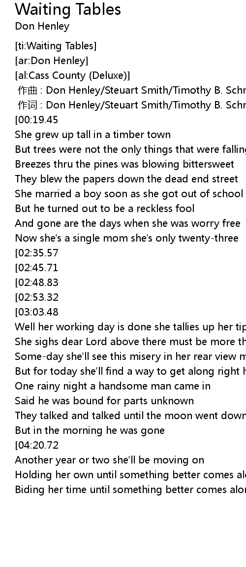 | [03:47.80][04:20.72] | Waiting tables she' s just waiting tables |
