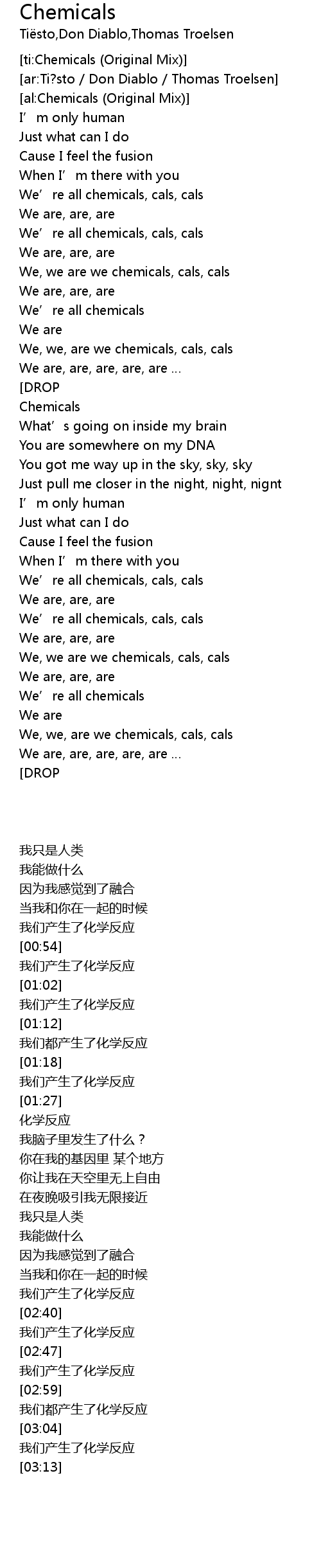 | [01:20] | We, we, are we chemicals, cals, cals |