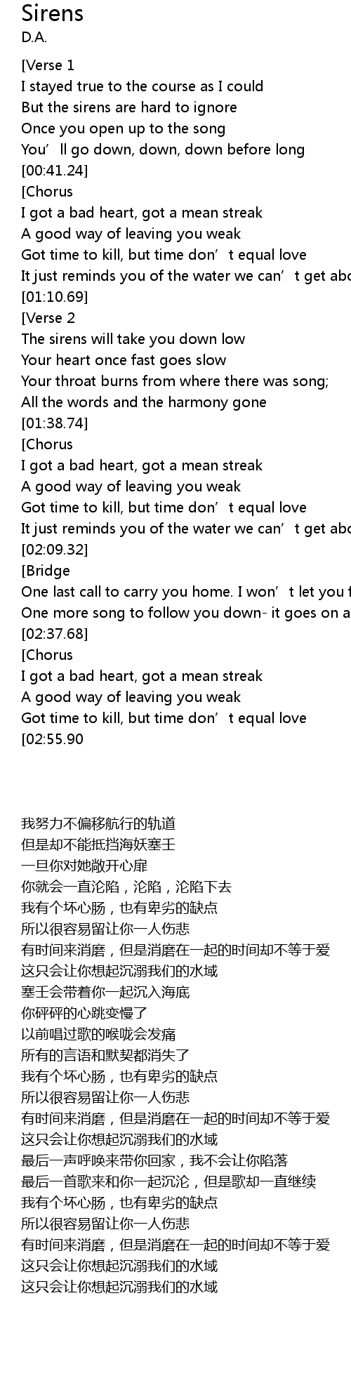 | [00:43.19] | I got a bad heart, got a mean streak |
