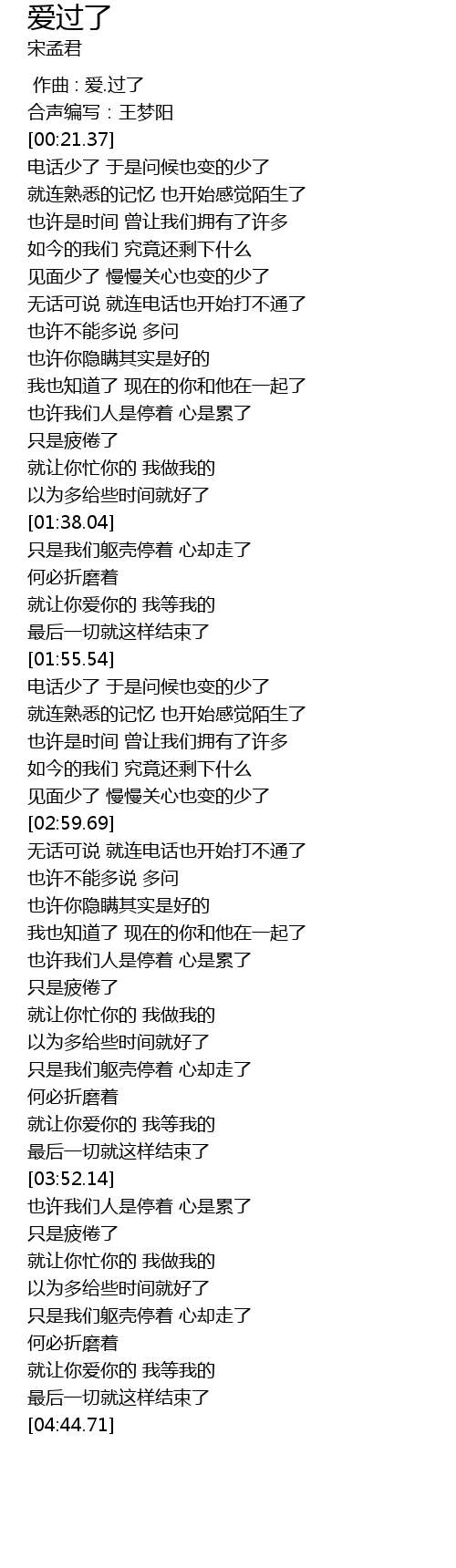| [01:38.63] | 只是我们躯壳停着 心却走了 |