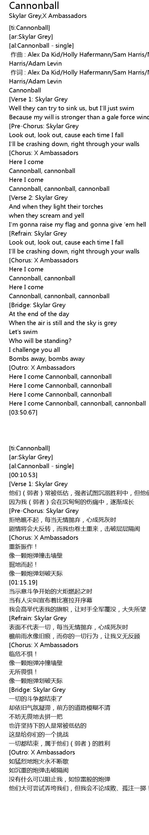 | [02:23.84] | Cannonball, cannonball, cannonball |
