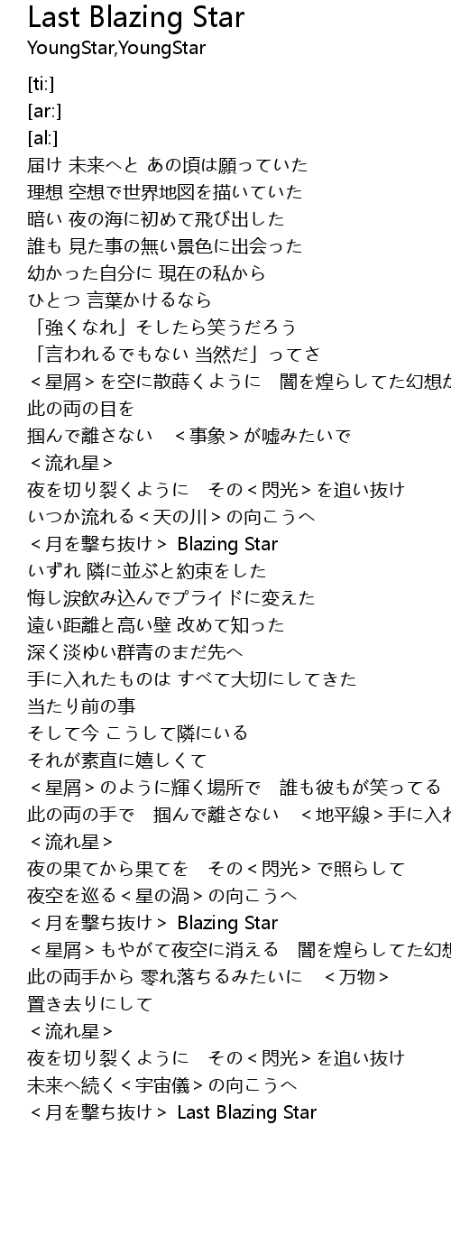 | [04:06.65] | <流れ星> 夜を切り裂くように その<閃光>を追い抜け |