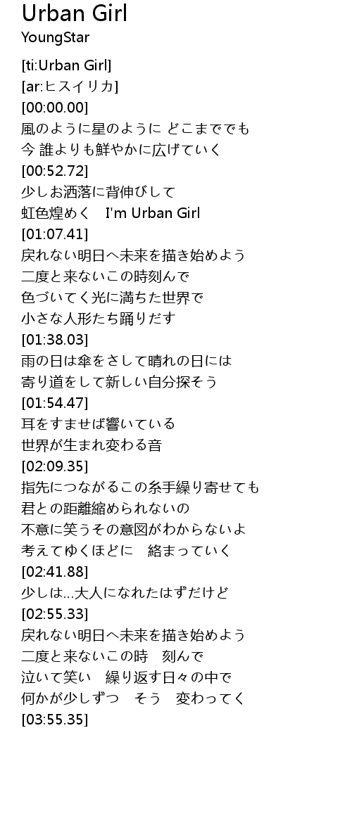 | [00:59.85] | 虹色煌めく I'm Urban Girl |